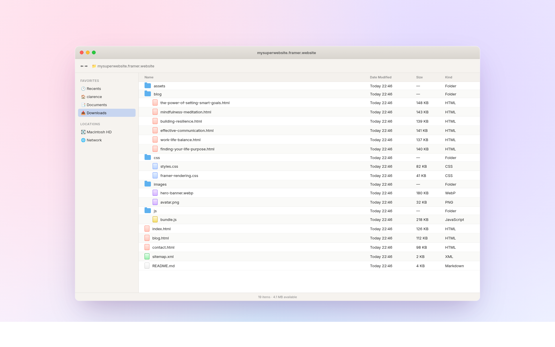 Under two minutes. Every HTML page, every stylesheet, every image, font, video and CMS entry, byte-for-byte. Framer Motion, Webflow IX2 and Wix Velo animations ship identical. Badge stripped on the way out.